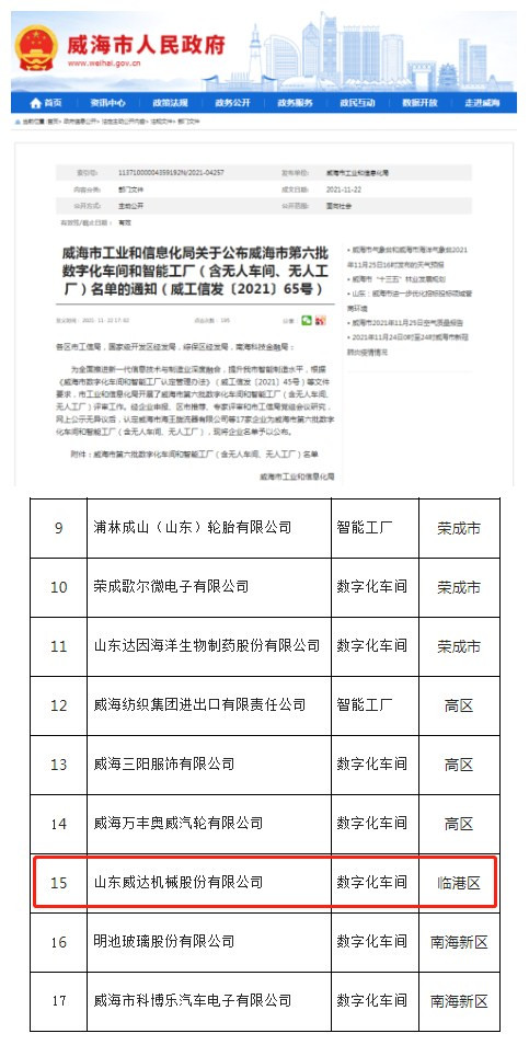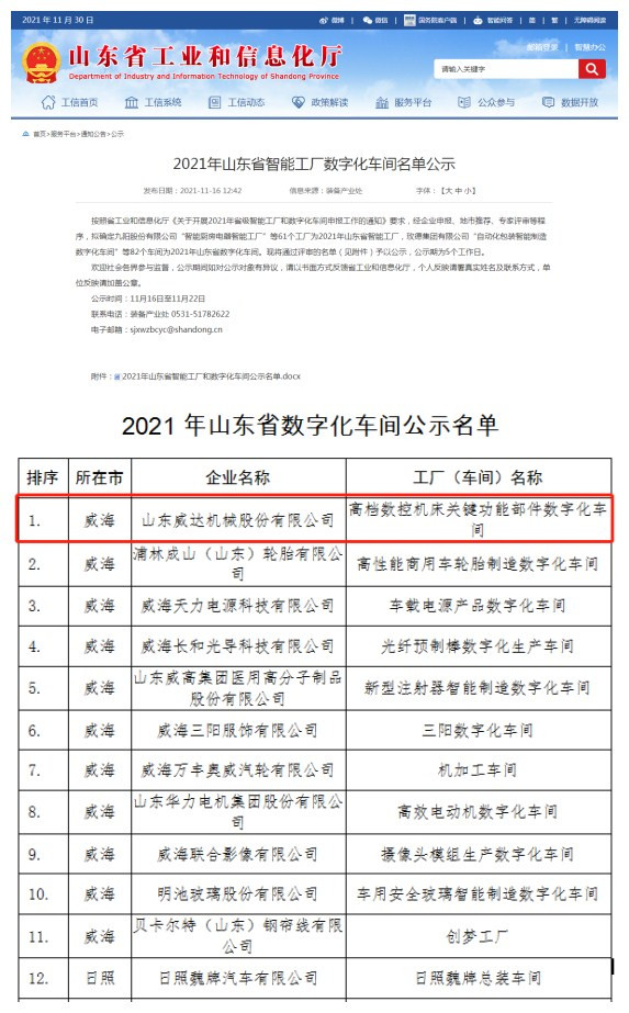 近日,山东省工信厅和威海市工信局相继公布了《2021年山东省数字化车间公示名单》、《威海市第六批数字化车间名单》,yL23411永利官网登录机械股份有限公司双喜临门,公司数字化车间相继通过省市两级认定。