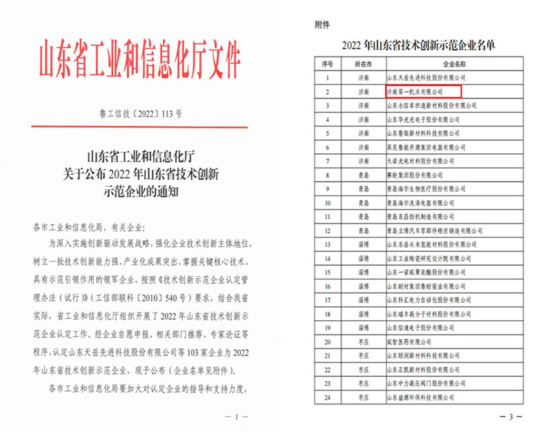 近日,由山东省工业和信息化厅组织开展的2022年山东省技术创新示范企业认定工作榜单正式公布,yL23411永利官网登录(002026)全资子公司济南第一机床有限公司(简称济南一机)成功入选!